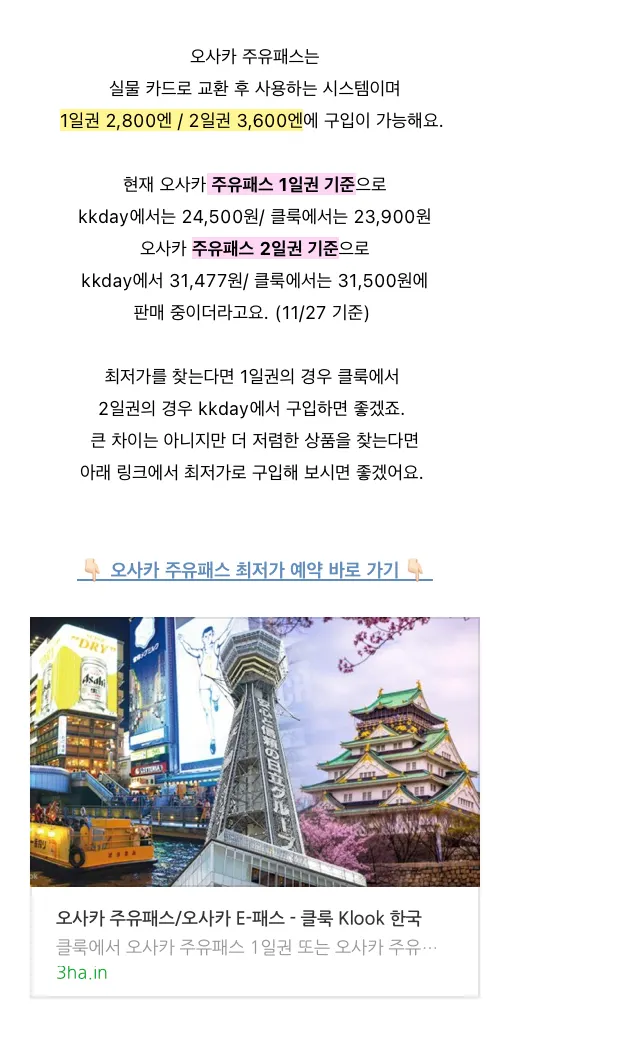 ์ฅ๊ถ์ด๋ผ๋ฉด ํด๋ฃฉ, KKDAY, ๋ง๋ฆฌํธ, ์๊ทธ ๋ฑ์ ํ๋ซํผ๋ณ ๊ฐ๊ฒฉ ๋น๊ต๋ฅผ ํด์ฃผ๋ ๊ฒ๋ ์ข์ต๋๋ค. (์ฒจ๋ถ ์ด๋ฏธ์ง์ฒ๋ผ์!) ๊ทธ๋ฌ๋ฉด ์๋ฌด๋๋ ์ต์ ๊ฐ ๋งํฌ์ ๋ํ ํด๋ฆญ์๊ฐ ์ฌ๋ผ๊ฐ๊ณ ํ๋งค ์ ํ์ ๊ฐ๋ฅ์ฑ๋ ๋์์ง๊ฒ ์ฃ ?