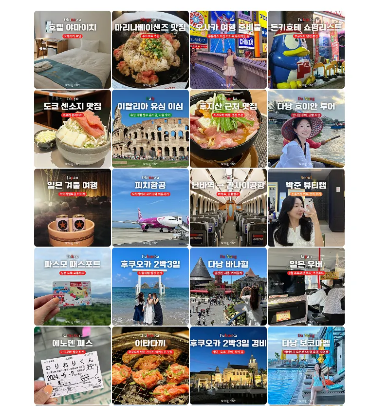 그리고 막 아래 이미지만 봐도 연결성이 없잫아요. 예를 들어서 오사카다 하면 오사카- 오사카-오사카 - 오사카 관련 내용을 쓰고 하나 다른 내용을 쓰는 형식이 되어야하는데, 지금 보면 다 다른내용이에요. 연결이 없어요. 그러니까 이런 연결성을 갖추기 위해서 뾰족한 컨셉하나를 정하시고 그에 맞게 포스팅하시면 될 것 같습니다.