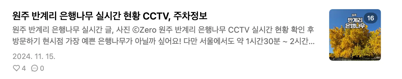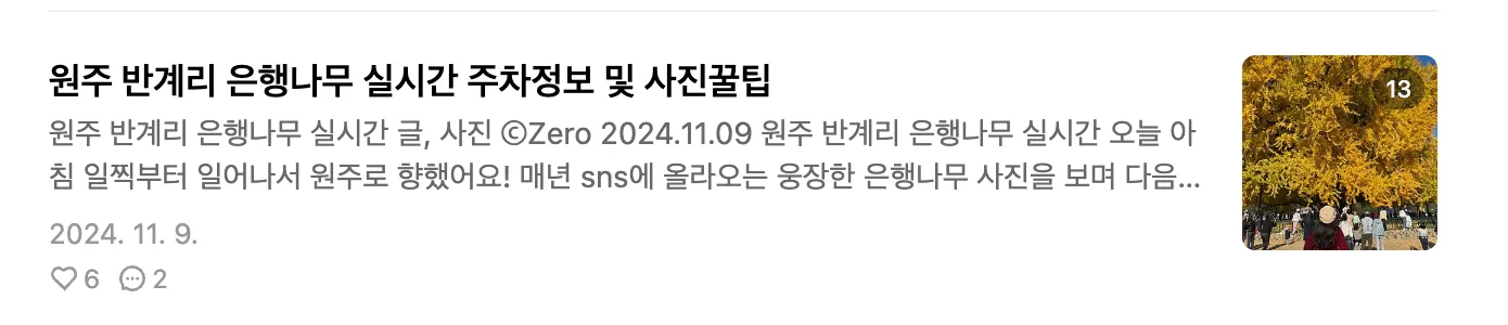 또한 사용이 반복적으로 이뤄지면 안됩니다. 아래같이 원주 반계리 은행나무 를 같은 키워드로 쓸 경우에는 이전에 포스팅 한 콘텐츠가 노출되지 않습니다.