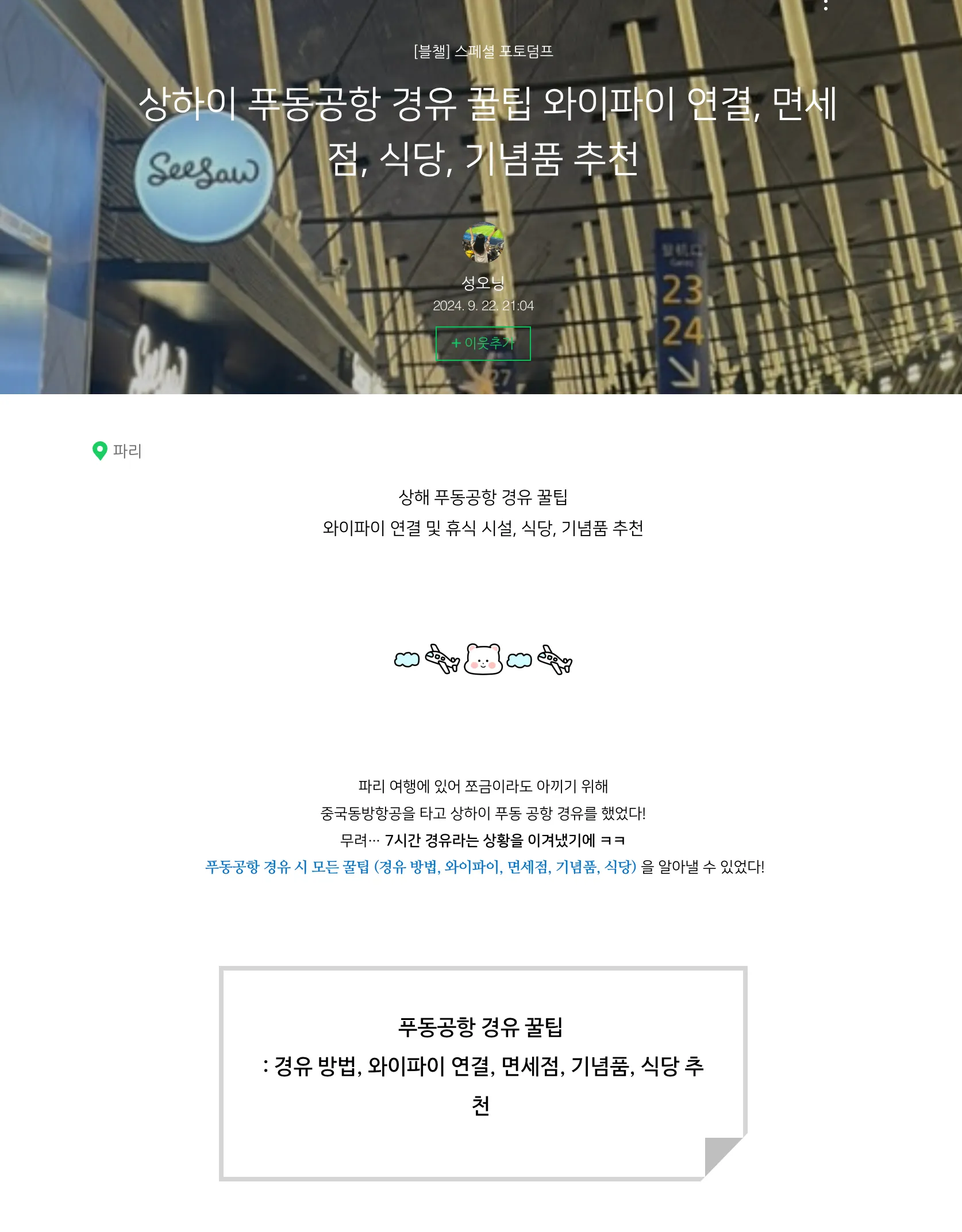 푸동공항이라고 하셨는데, 해당 키워드를 메인 키워드로 잡을 정도로 방문자수가 많지 않으시니, 최대한 소형키워드를 메인 키워드로 잡아주세요.