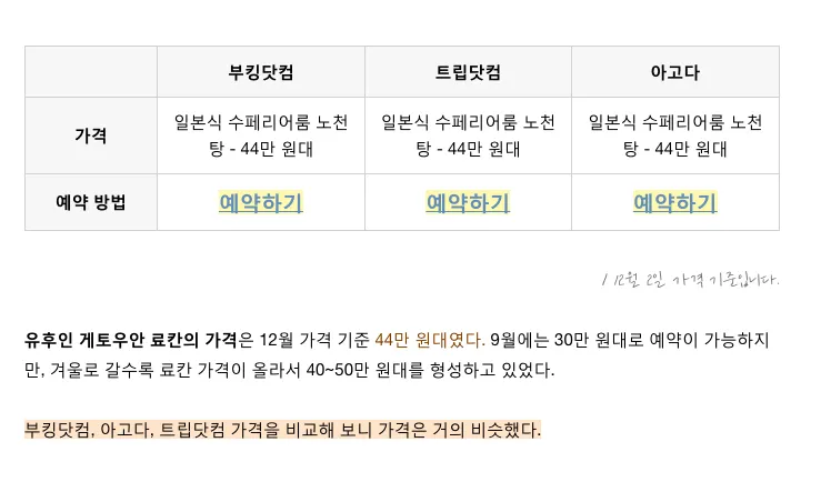 총평 앞에 있는 결론이 맥락적으로 맞지 않습니다. 결국 내가 이 호텔을 선택한 이유가 개별 노천탕이 있는 료칸을 찾았는데 여기 있었어! 라는 이야기인데, 개별 노천탕 있는 료칸은 유후인에 아주 많습니다. 이 부분을 개별 노천탕이 있는 료칸 중에 가성비라던지 자연속에서 노천온천을 즐길 수 있다는 것이 도심속에 있는 유후인 료칸보다 뛰어나다는 점을 부각시킨 결론을 내려준다면 더 좋을 것 같습니다. 그리고 가격적인 부분에서도 다 비슷하다가 아니라 단 1%라도 싼거 단 몇 백원이라도 싼걸 비교해줘야지 전환이 일어납니다. 트립닷컴의 경우 예약할때 세시간전 트립닷컴 쿠폰을 사용하면 할인받아 최저가가 된다 라는 부분도 작성한다면 더 전환이 될 수 있을 것 같습니다.